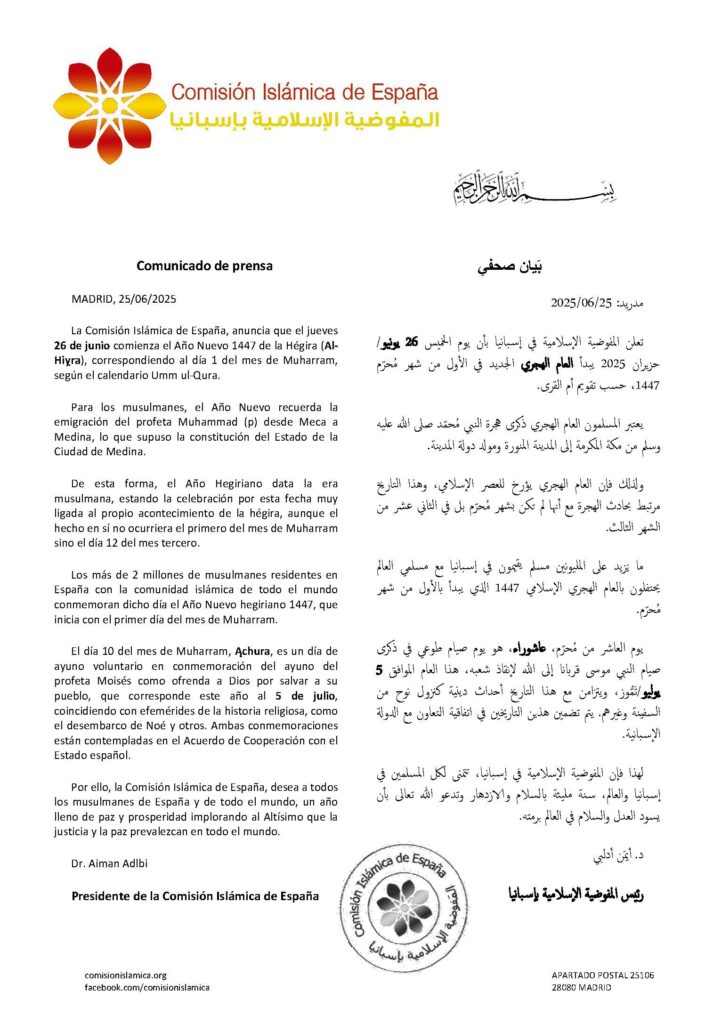 La Comisión Islámica de España, anuncia que el jueves 26 de junio comienza el Año Nuevo 1447 de la Hégira (Al-Hiỵra), correspondiendo al día 1 del mes de Muharram, según el calendario Umm ul-Qura.