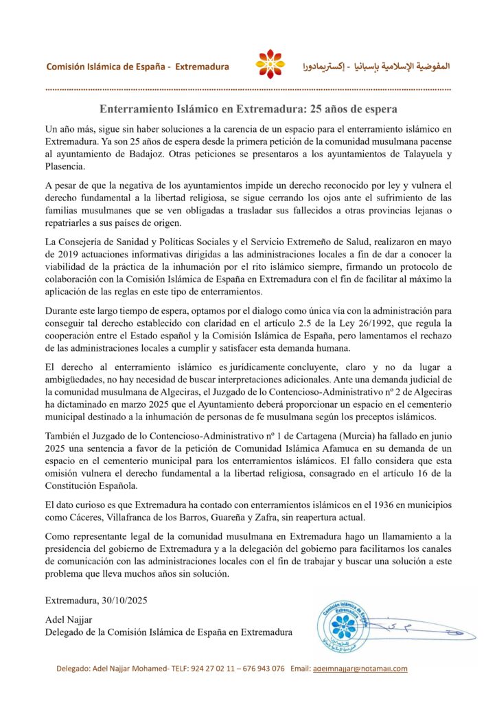 Como representante legal de la comunidad musulmana en Extremadura hago un llamamiento a la presidencia del gobierno de Extremadura y a la delegación del gobierno para facilitarnos los canales de comunicación con las administraciones locales con el fin de trabajar y buscar una solución a este problema que lleva muchos años sin solución.