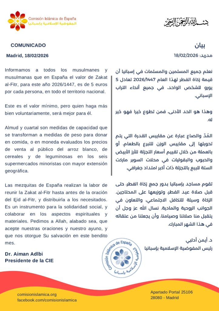 Informamos a todos los musulmanes y musulmanas que en España el valor de la Zakat al-Fitr, para este año 2026/1447, es de 5 euros por cada persona, en todo el territorio nacional.